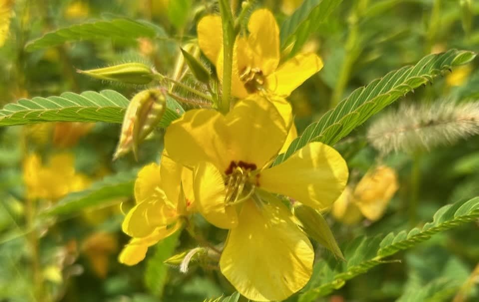 Chamaecrista fasciculata, commonly known as partridge pea, is a showy annual wildflower that thrives in well-drained soils under full sun, tolerating light shade. Native to various habitats across the eastern and midwestern U.S., this plant grows 1-3 feet tall and blooms with large yellow flowers from late June to September. Its sensitive leaves, which fold when touched, and its ability to self-seed in dry areas make it an excellent choice for attracting pollinators and providing cover for wildlife.